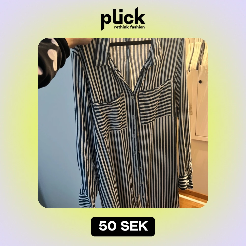 Säljer en snygg randig skjorta i blått och vitt. Den har långa ärmar och knappar framtill. Perfekt för både vardag och fest! Skjortan har en klassisk krage och två bröstfickor som ger en stilren look. Passar bra till jeans eller kjol/strumpbyxor för en avslappnad stil.