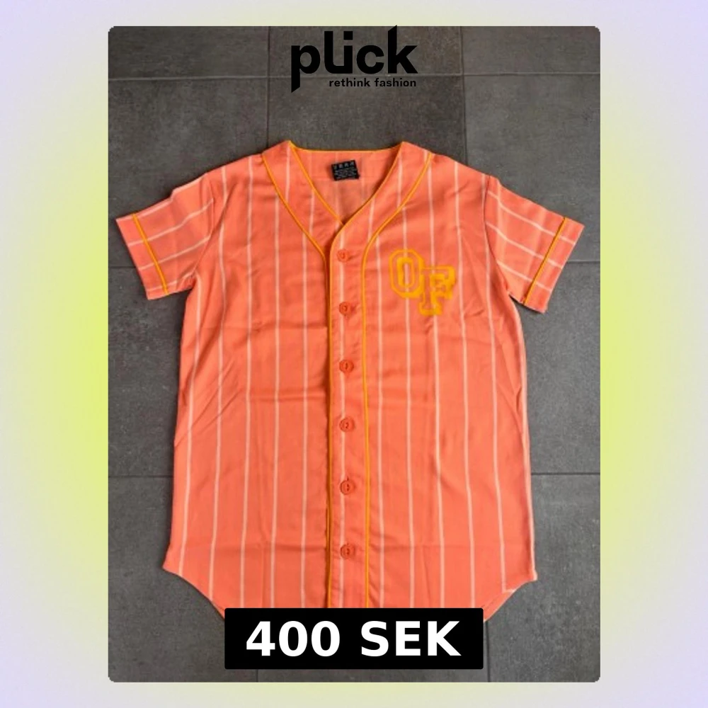 Säljer en orange baseballinspirerad skjorta från OF med vita vertikala ränder och gula detaljer. Skjortan har korta ärmar, knappar framtill och ett gult OF-tryck på bröstet. Perfekt för dig som vill sticka ut med en sportig vibe.