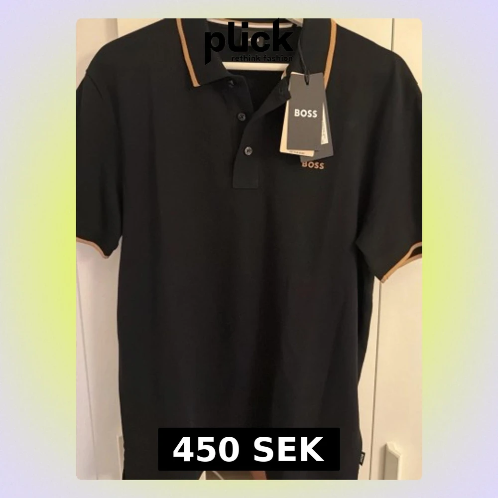 Snygg svart pikétröja från BOSS med beige kantband på krage och ärmslut. Storleken är M och den e helt ny, inte använd en ända gång