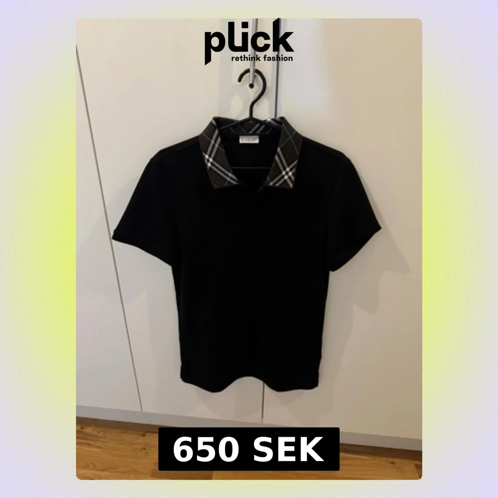 Snygg svart topp från Burberry med klassisk rutig krage i brunt, vitt och blått. Kortärmad modell med normal passform, perfekt för en stilren och trendig look. Ikonisk detalj med Burberrys signaturrutor på kragen.