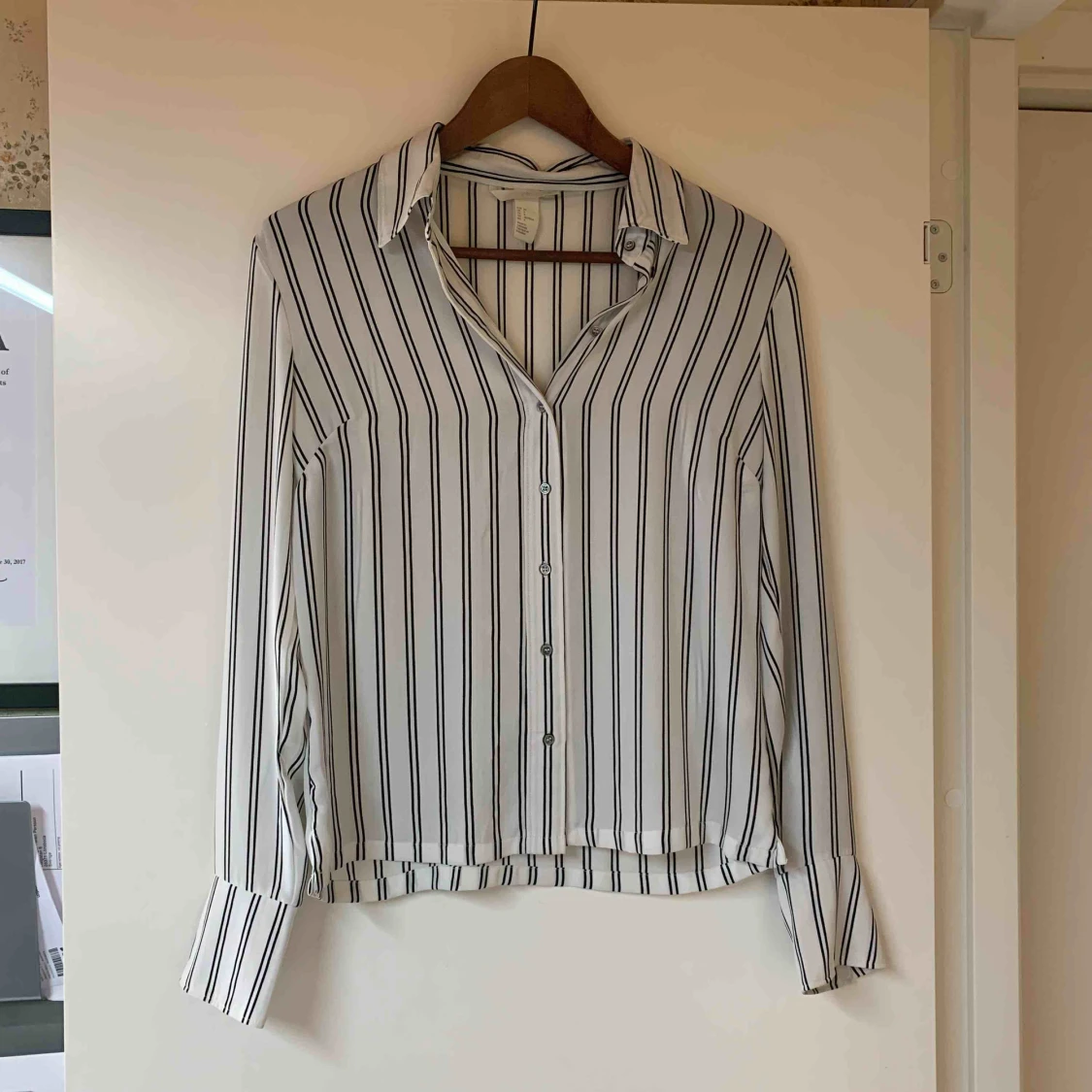 Långärmad randig blus i polyester. Använd två gånger.