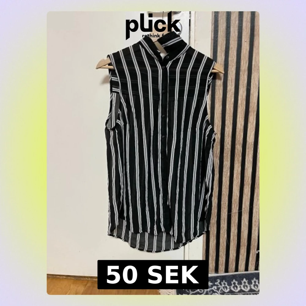 Snygg ärmlös skjorta med svart botten och vita vertikala ränder. Skjortan har en hög krage och knappar framtill. Materialet är lätt och luftigt, perfekt för varmare dagar. Passformen är normal och skjortan har en modern, stilren look.
