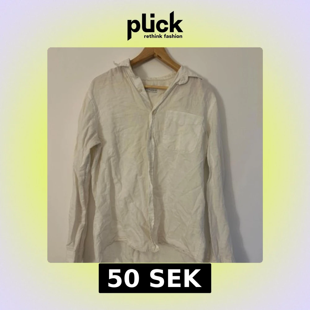 Säljer en stilren vit linneskjorta från H&M. Skjortan har en klassisk krage och en bröstficka. Perfekt för en avslappnad look med sin luftiga passform och långa ärmar. Passar bra till både jeans och chinos.
