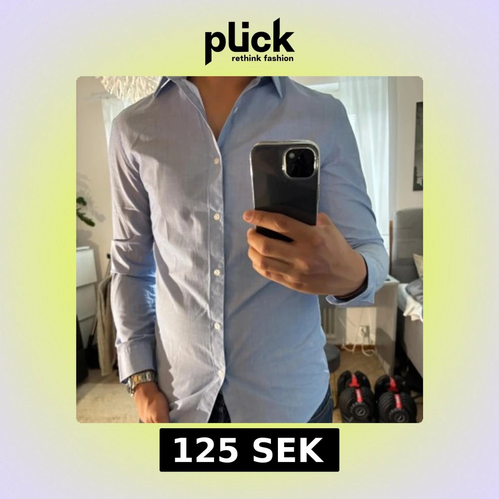Säljer en ljusblå slim fit skjorta från H&M med klassisk krage och vita knappar. Skjortan är långärmad och tillverkad i ett tunt, lätt bomullstyg som är easy iron. Perfekt för dig som gillar stilren och enkel look.