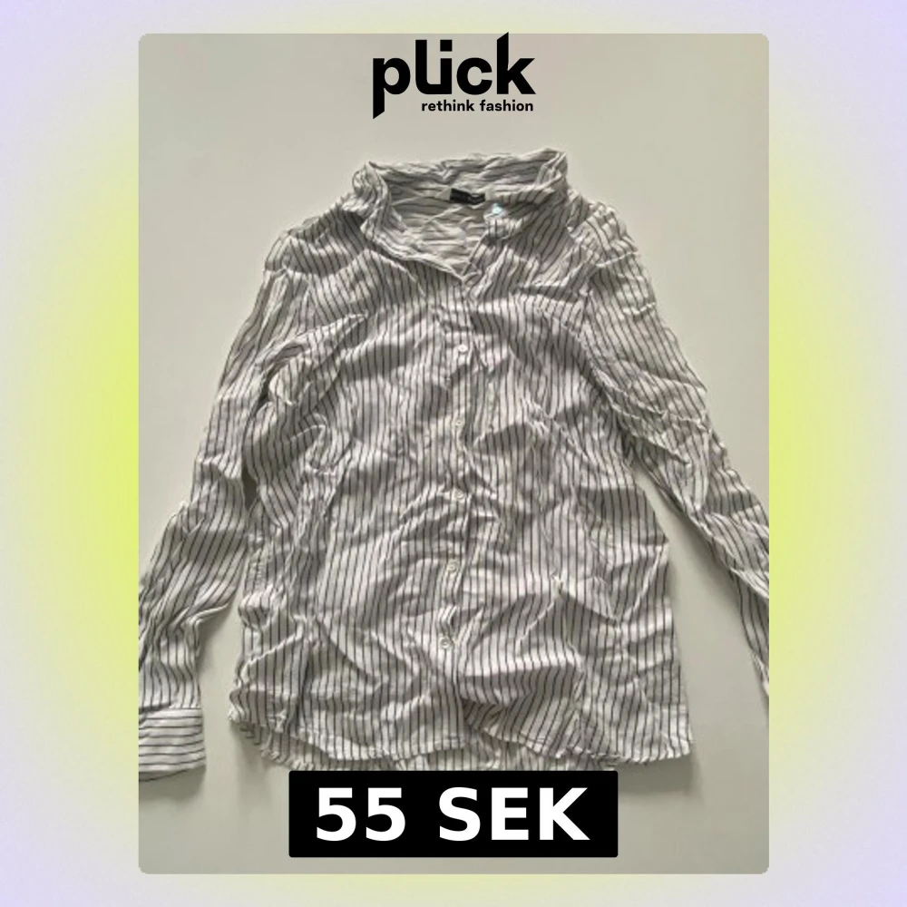 Säljer en vit skjorta från H&M med svarta vertikala ränder. Skjortan har klassisk krage, knäppning framtill och långa ärmar.