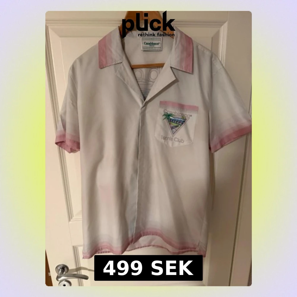 Säljer en vit kortärmad skjorta från Casablanca med rosa detaljer och tryck på bröstficka och rygg. Skjortan har klassisk krage och motiv med palmer, tennisbana och texten 'Tennis Club'. Perfekt för dig som gillar sportig och trendig stil.