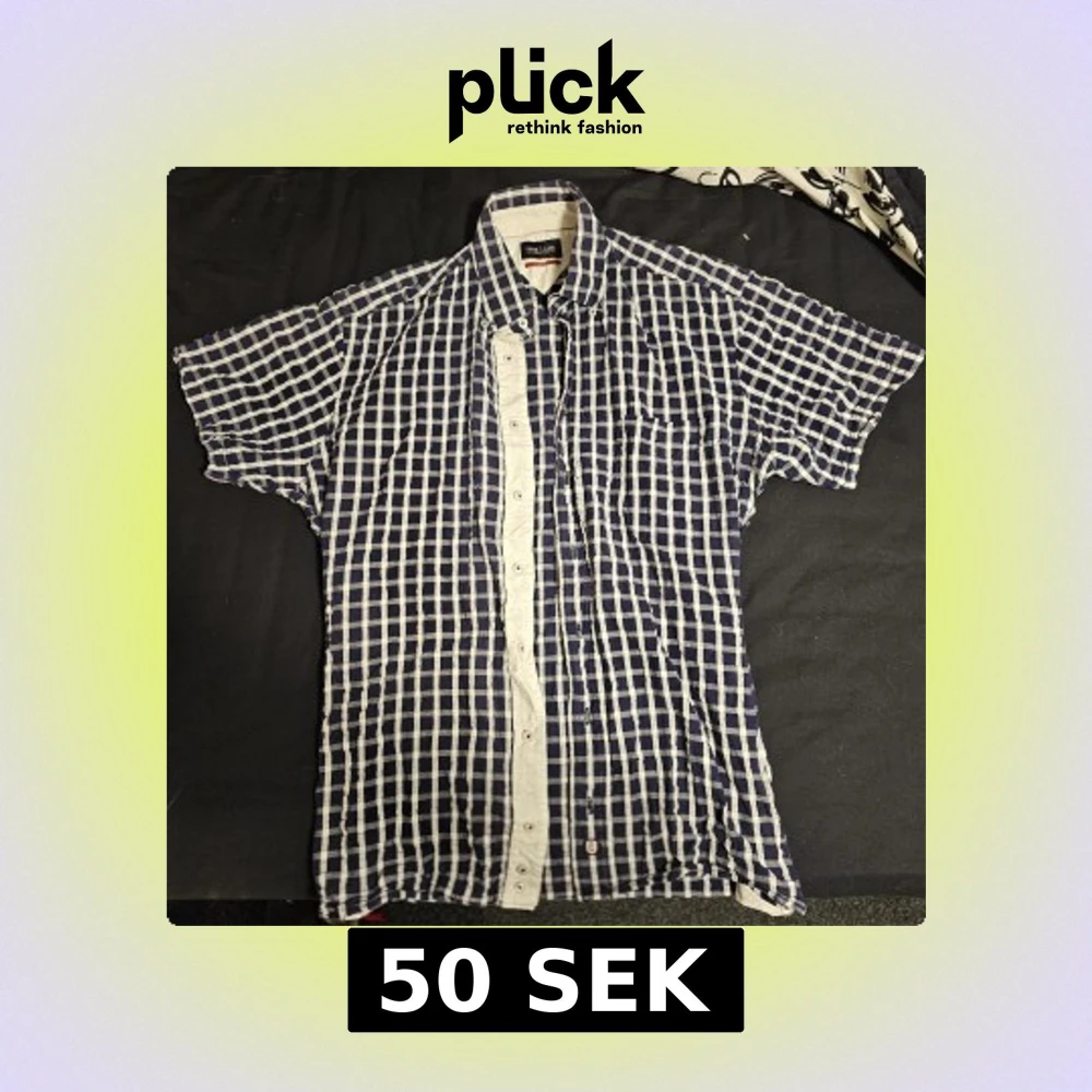Kortärmad skjorta L i blått och vitt rutigt mönster. Skjortan har klassisk krage, knappstängning framtill och en bröstficka. Perfekt för en avslappnad och cool stil under varmare dagar.