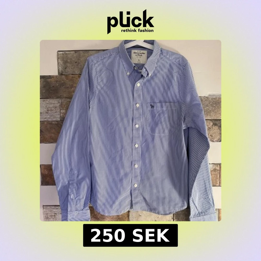 Säljer en stilren blå och vit randig skjorta från Abercrombie & Fitch. Skjortan har långa ärmar och en klassisk krage med knappar framtill. Perfekt för en avslappnad men ändå uppklädd look.