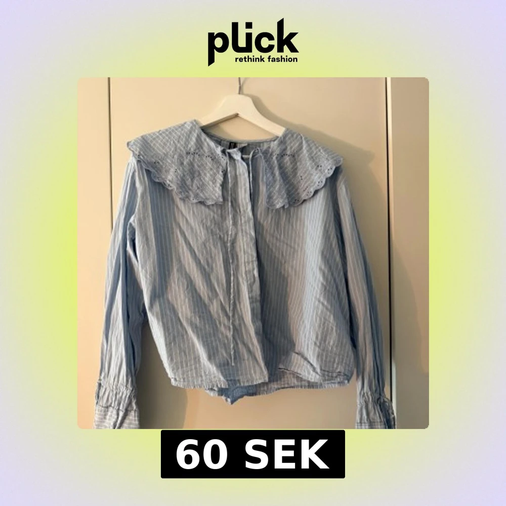 Säljer en ljusblå randig skjorta från Divided med stor broderad spetskrage och långa ärmar med smock vid ärmslut. L men sitter fint som en S