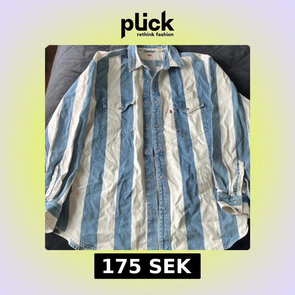 Säljer en oversized jeansskjorta från Levi's med breda blå och vita ränder. Skjortan har två bröstfickor med knappar och klassisk krage. Tillverkad i bomull och har en avslappnad passform som ger en cool och trendig look.