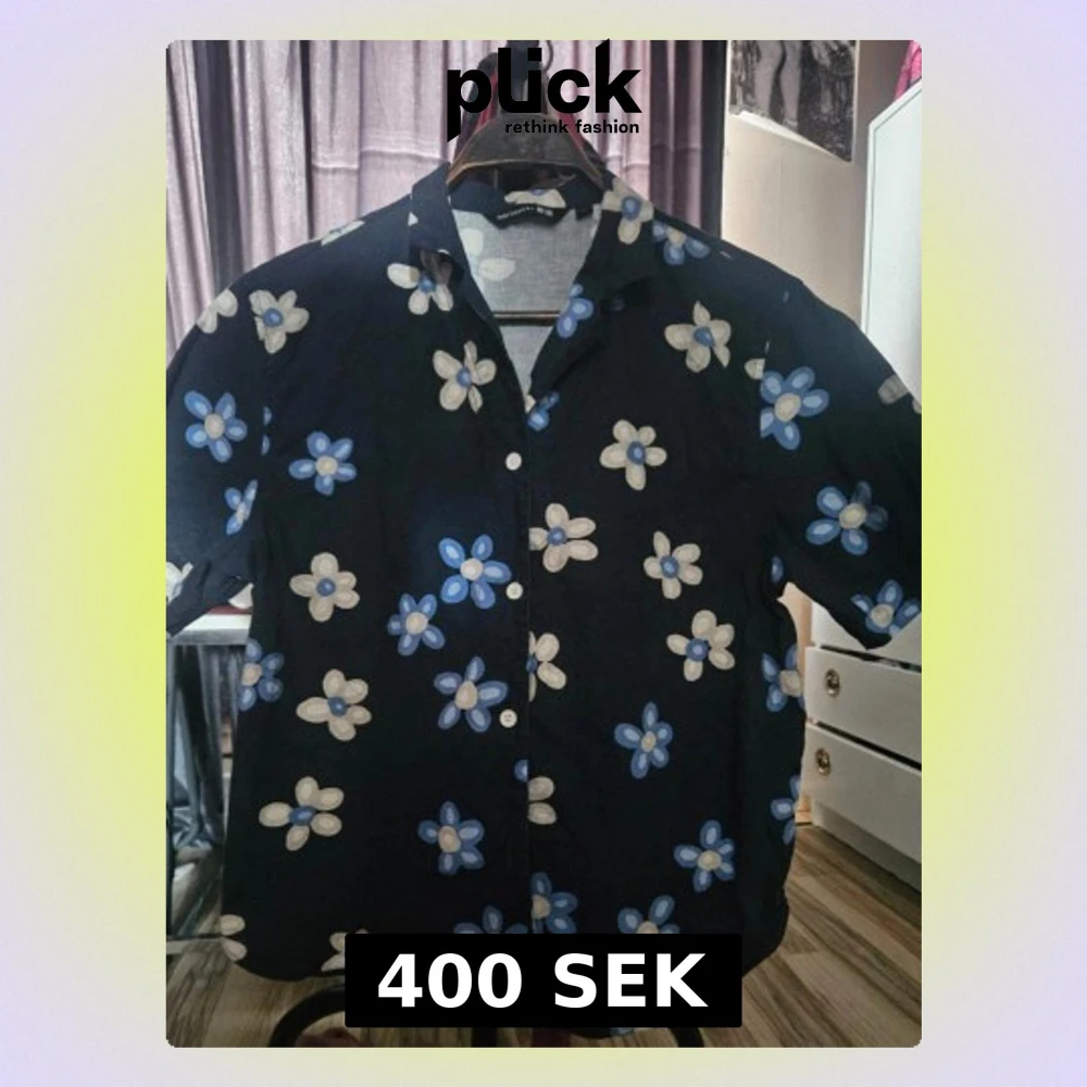 Snygg mörkblå skjorta med kort ärm och stora blommor i blått och vitt. Storlek M Skjortan har klassisk krage och knappar framtill. Perfekt för dig som vill sticka ut med ett lekfullt mönster. Materialet känns lätt och luftigt, perfekt för varmare dagar.