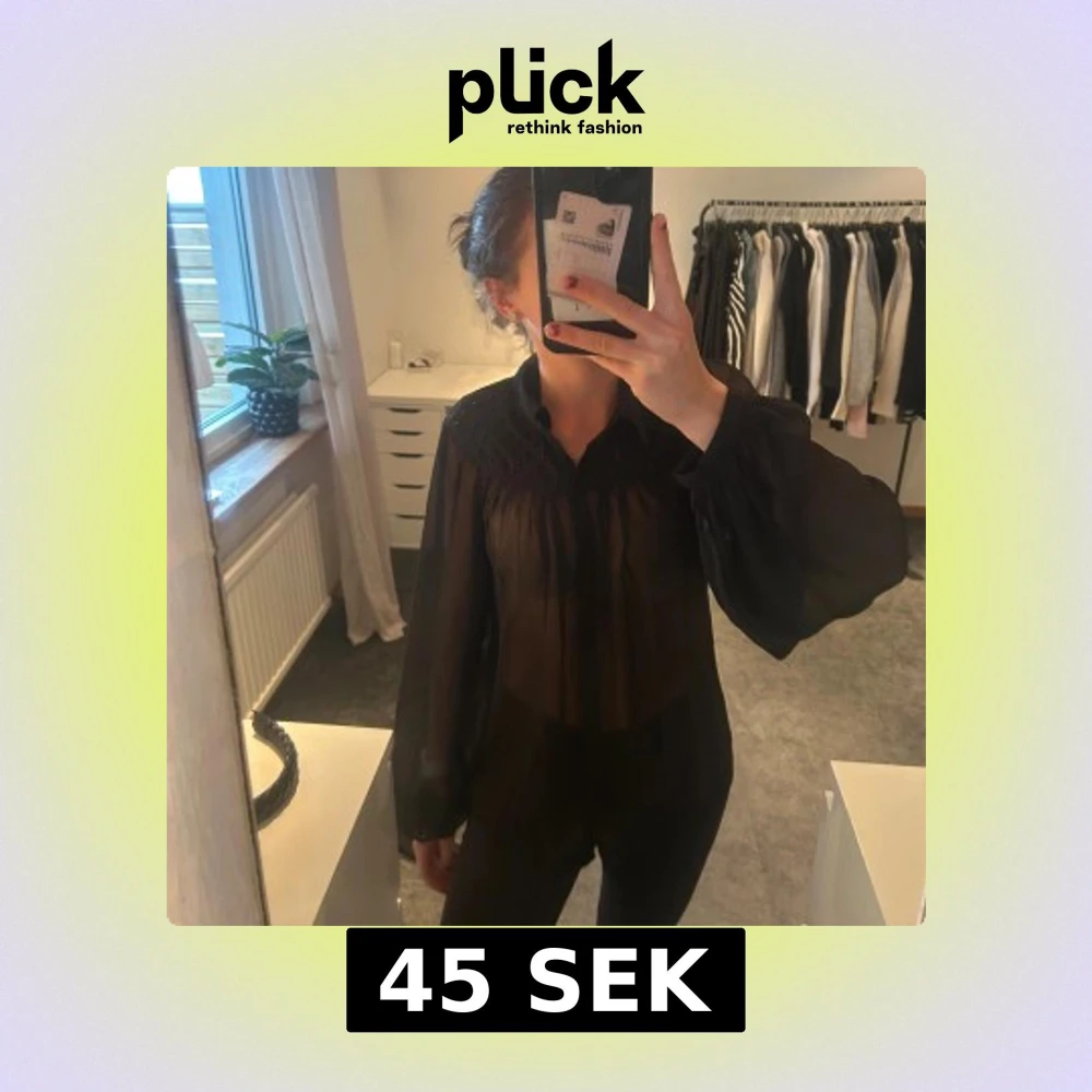 En genomskinlig svart skjorta med pärlor på axlarna. Alla lappar är tyvärr bortklippta så vet inte märke eller storlek men som referens är jag en S