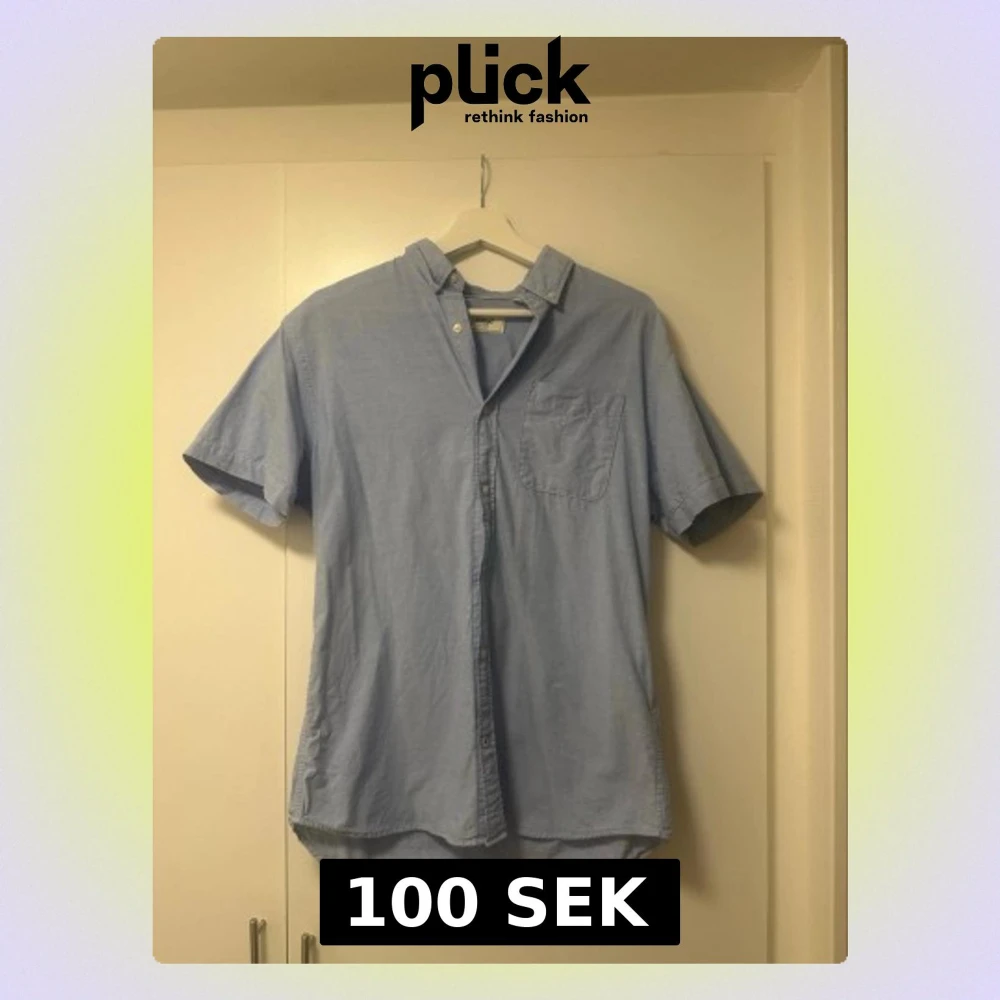 Fräsch ljusblå skjorta från Produkt i storlek M. Skjortan har korta ärmar, klassisk krage med knappar och en bröstficka. Nedersta knappen är ditsydd med svart tråd.