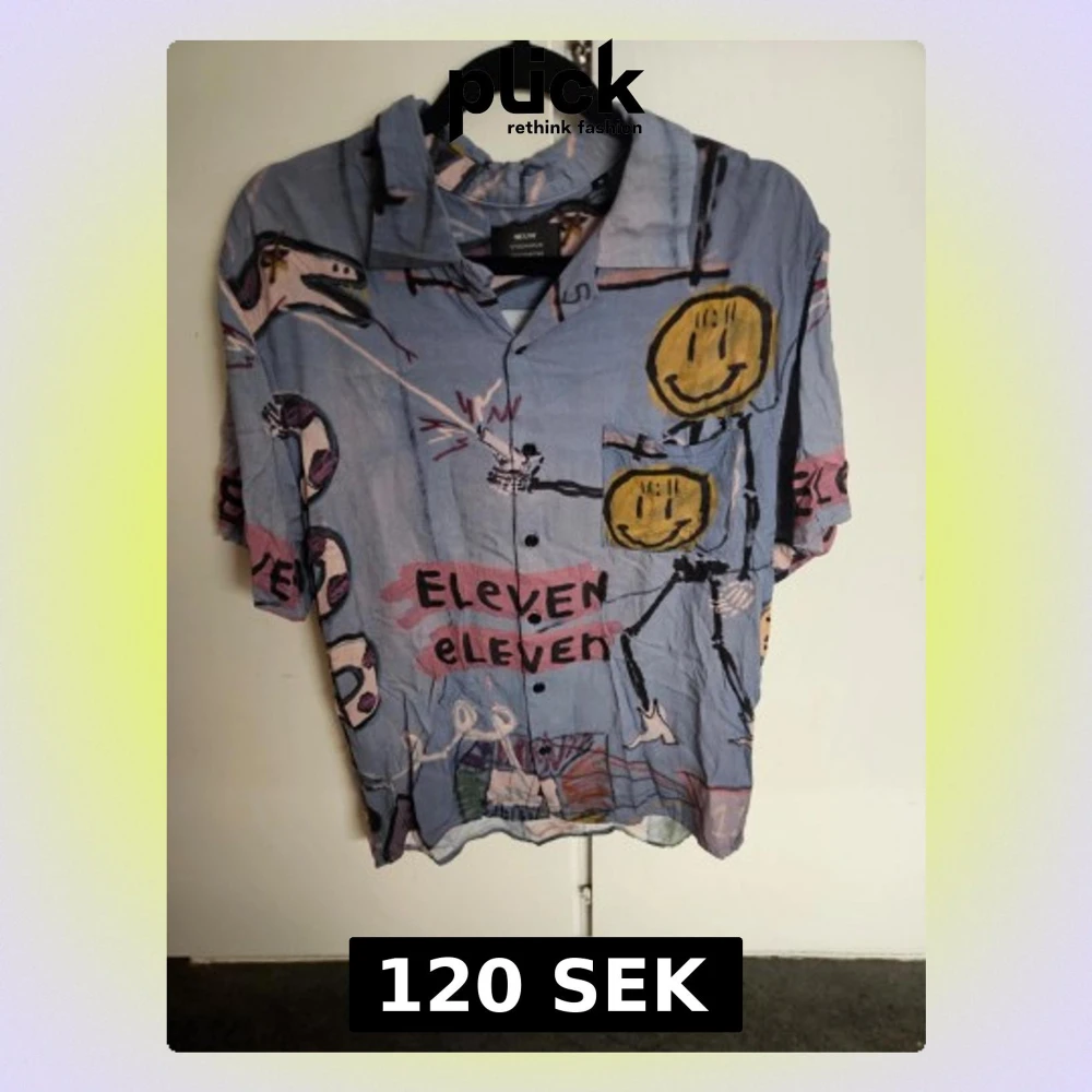 Unik blå skjorta från Neuw med färgglatt abstrakt mönster och smileys. Skjortan har korta ärmar, klassisk krage och knappar framtill. Perfekt för dig som vill sticka ut med en kreativ och lekfull stil.
