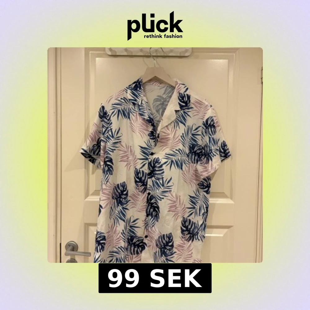 Snygg vit skjorta med korta ärmar och knappar framtill. Skjortan har ett tropiskt bladmönster i blått och ljuslila, perfekt för sommarens varma dagar. Avslappnad passform och mjukt material som känns skönt mot huden.