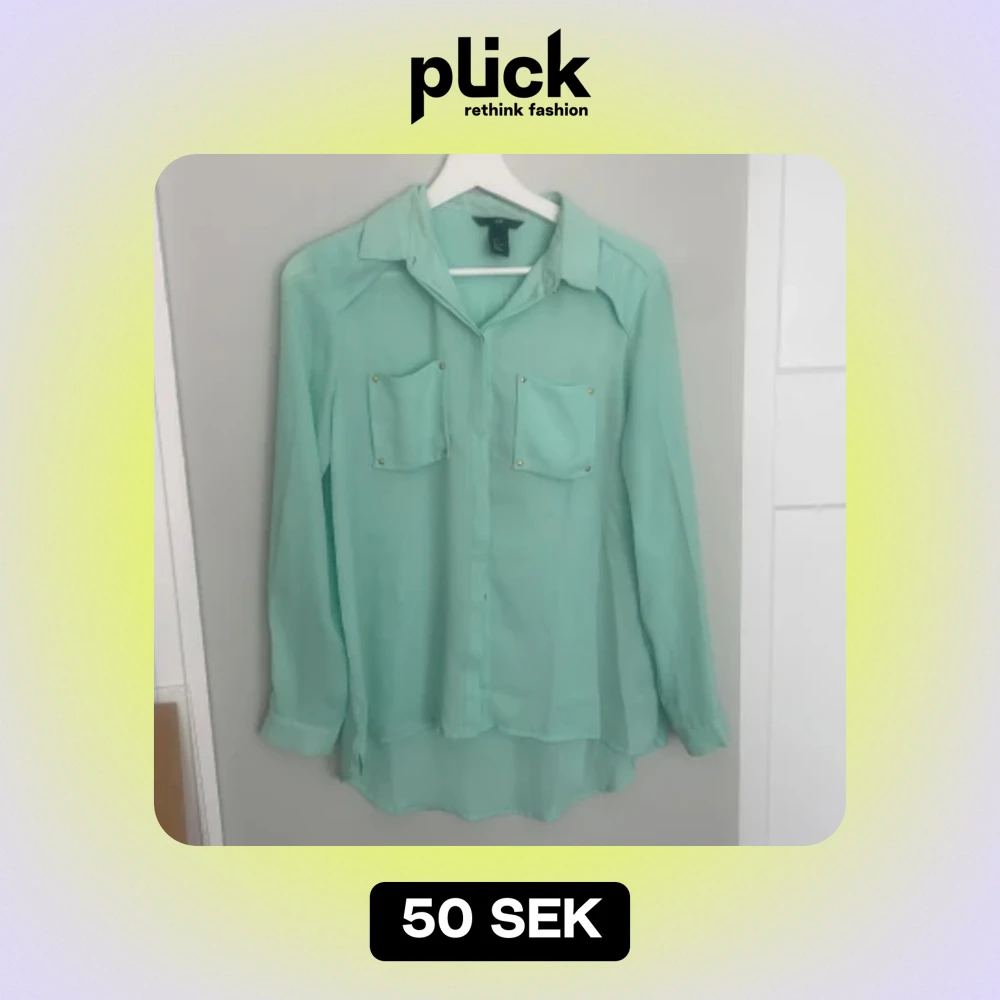 H&M skjorta Storlek 34 100% polyester Fin mintgrön färg med guldiga detaljer, lite mesh-känsla på tyget → lite snyggt genomskinlig Har två knappt synliga fläckar, dessa går med all säkerhet bort i tvätt