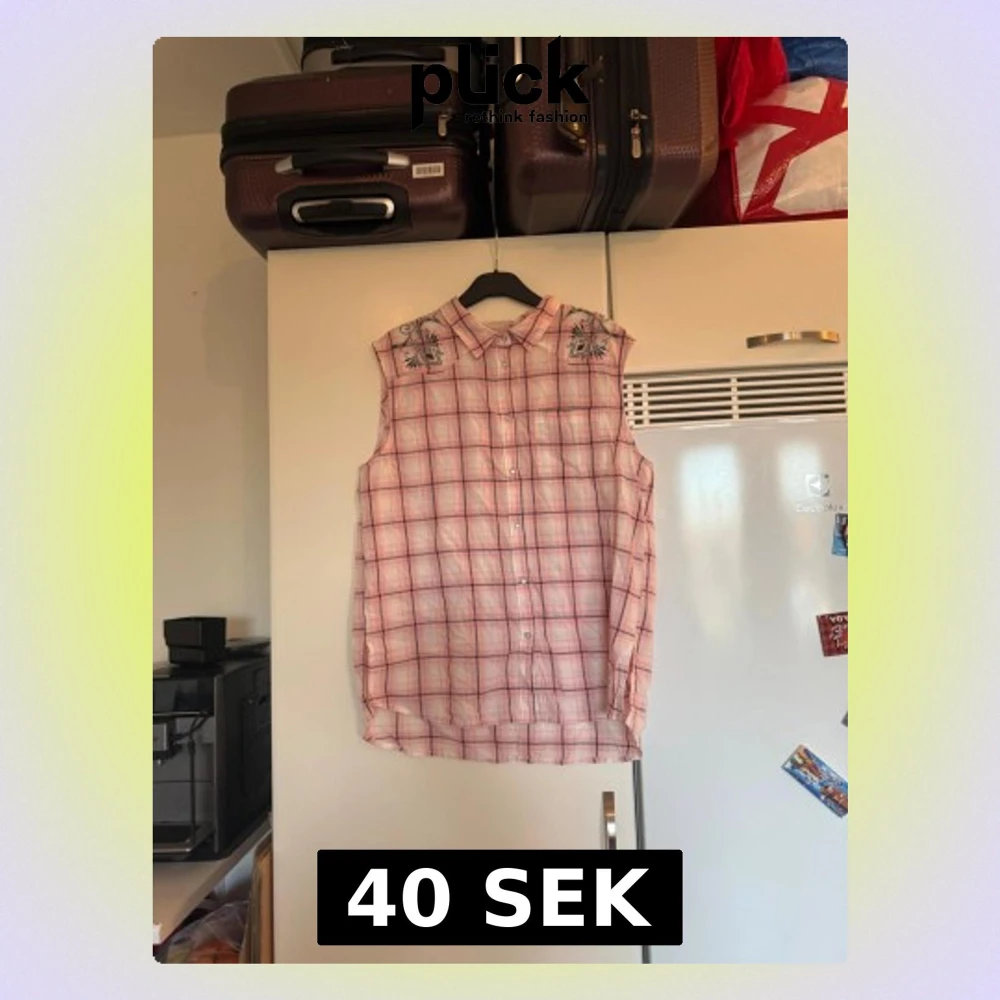 Säljer en ärmlös skjorta i tunn bomull med rosa och svarta rutor. Skjortan har knappar framtill och coolt broderi på axlarna. Perfekt för dig som gillar avslappnad och unik stil. Från märket Odd Molly i storlek 4 som enligt deras storleksguide motsvarar en storlek XL. Mer använd men fortfarande fint skick.