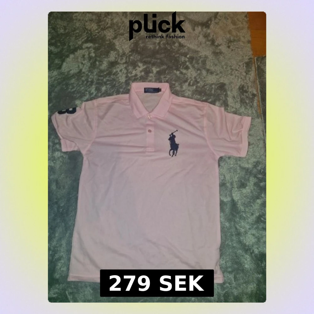 Säljer en rosa pikétröja från Polo Ralph Lauren i storlek M. Klassisk krage, knäppning med två knappar och stor mörkblå logga broderad på bröstet. Pikén har korta ärmar och är tillverkad i polyester