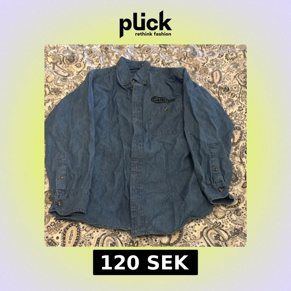 Säljer en klassisk blå jeansskjorta från Carlton med broderad logga på bröstfickan. Skjortan har lång ärm, knappar framtill och på manschetterna samt en bröstficka. Perfekt för en avslappnad stil.