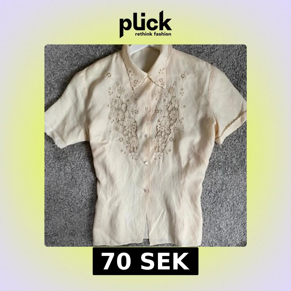 Supersöt beige skjorta med korta ärmar och spetsbroderier i blommigt mönster framtill. Skjortan har knappar och en krage med fina spetsdetaljer. Materialet känns lent och har en lätt glans, vilket ger en lyxig vibe. Perfekt för dig som gillar vintage och romantiska detaljer. Passar S/M.
