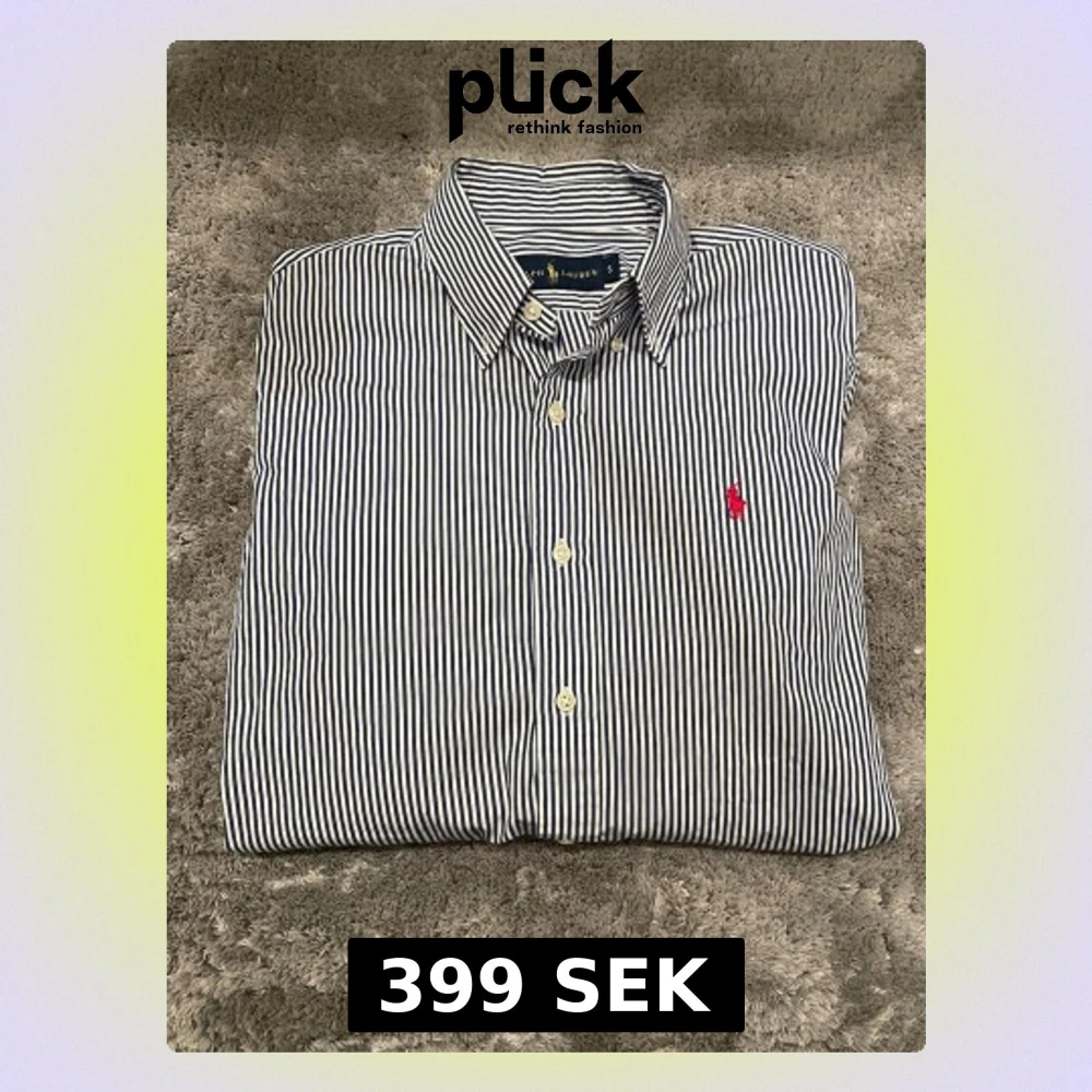 Säljer en klassisk skjorta från Ralph Lauren i storlek S. Skjortan är vit med smala marinblå ränder och har en röd broderad logga på bröstet. Tillverkad i bomull och har knappar framtill samt lång ärm. Perfekt för en clean och stilren look.jag är 178 cm och väger 63 kg. Skriv för fler frågor.
