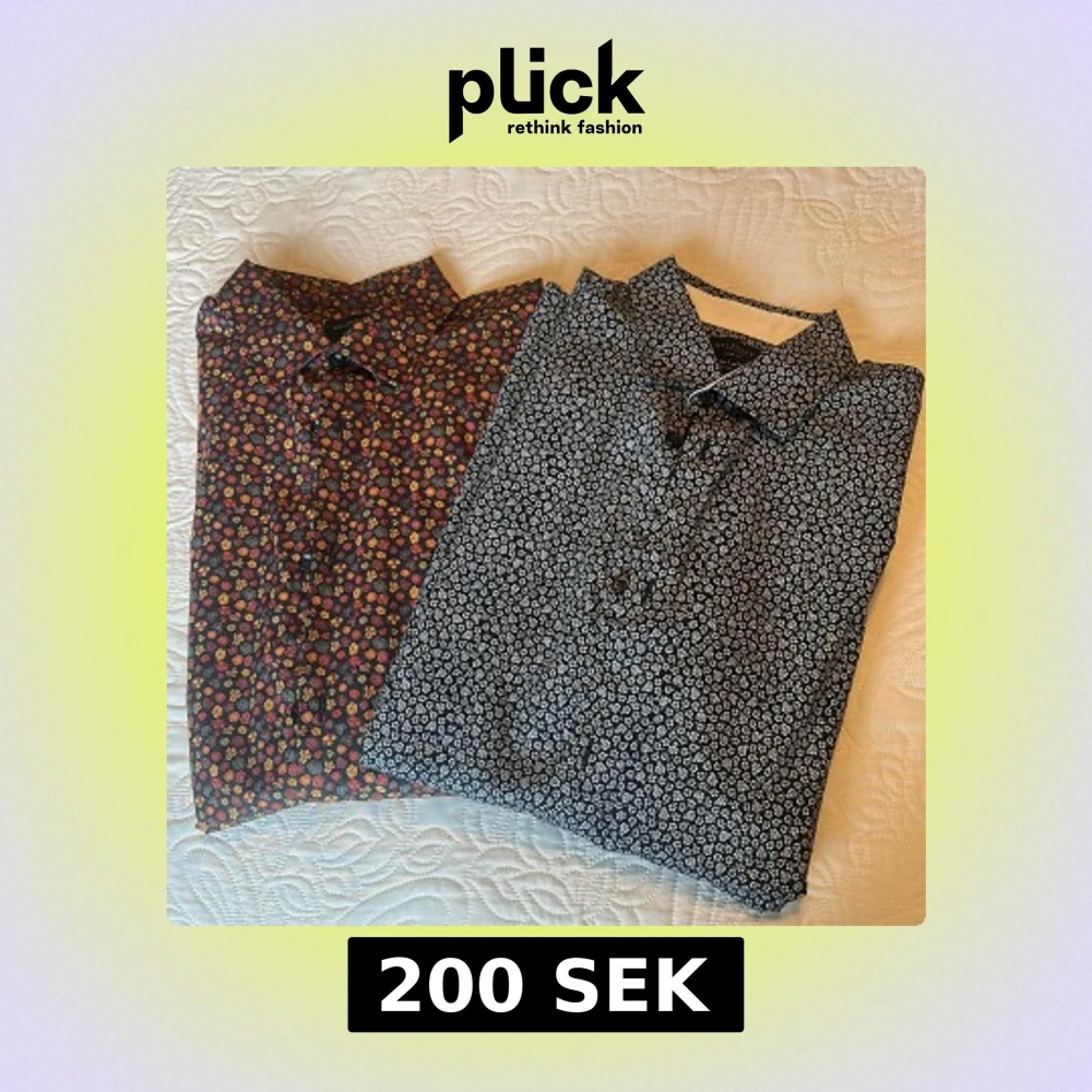 Två slim fit skjortor från Selected Homme i storlek L. Ena skjortan är svart med vita små blommor, den andra har mörk botten med blommor i rött, gult och orange. Båda är i riktigt fint skick.