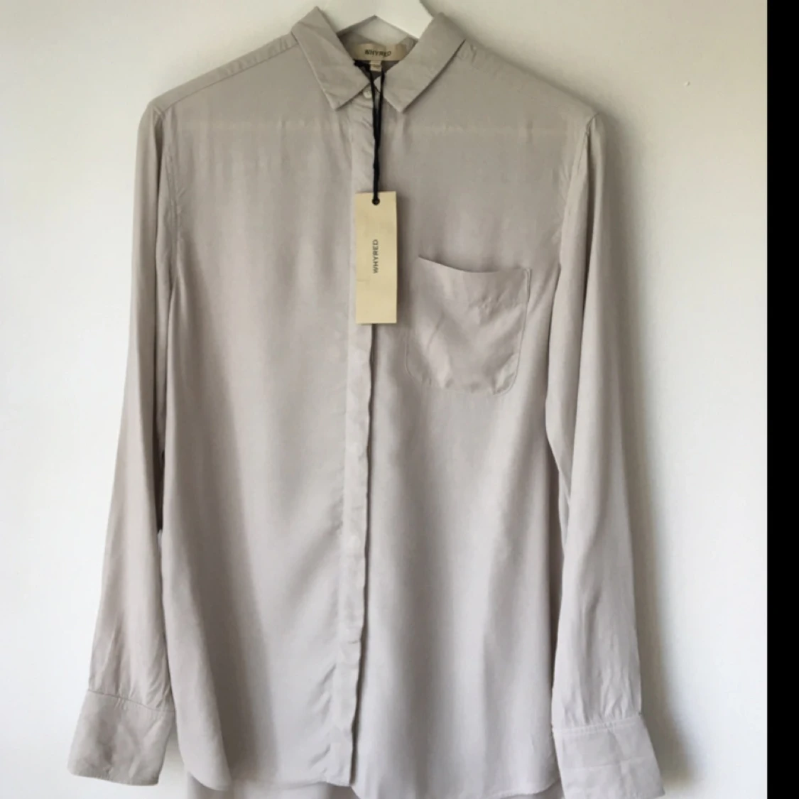 Oversize skjorta från Whyred. Är i Väldigt fint skick och är endast använde vid ett tillfälle. Kostar 1600 kr i butik. Färgen är ljus grå/grön/beige. 100 % viskos.