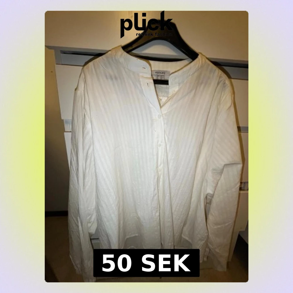 Säljer en vit skjorta från Esmara med diskreta vertikala ränder och ståkrage. Skjortan har knäppning framtill och långa ärmar. Tillverkad i ett lätt och luftigt tyg som ger en avslappnad look.