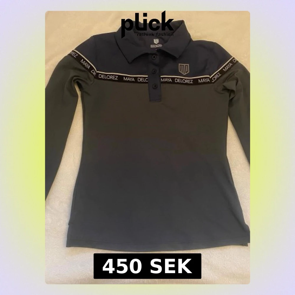 Snygg mörkblå henley från Maya Delorez med krage och tre knappar framtill. Skjortan har lång ärm och ett band med loggan 'Maya Delorez' över bröstet. Materialet är stretchigt och känns sportigt, perfekt för dig som gillar stilren design.