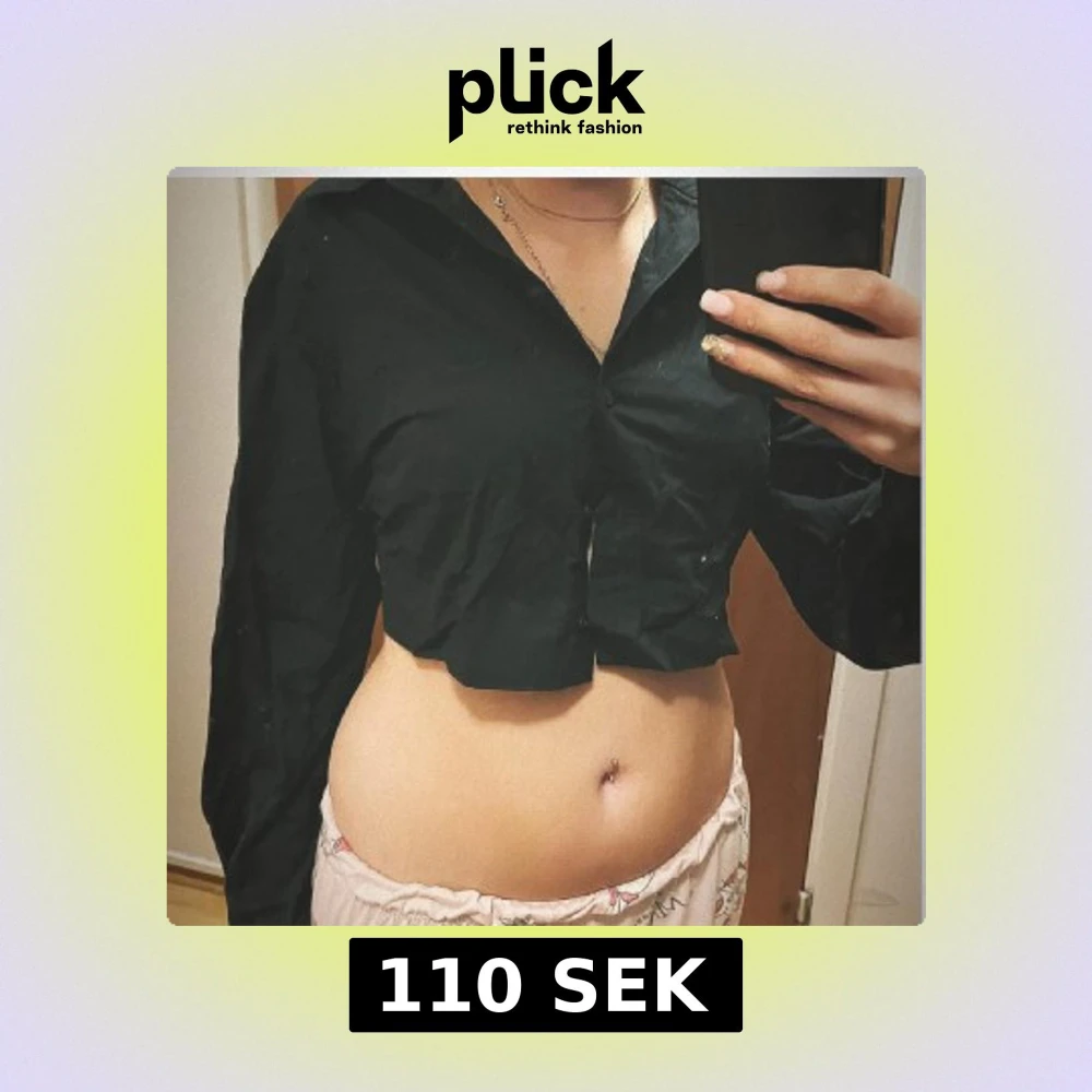 Säljer en svart croppad skjorta med klassisk krage och långa ärmar. Skjortan har knappar framtill och är perfekt för en trendig och avslappnad stil. skit snygg till några kostymbyxor eller jeans😘