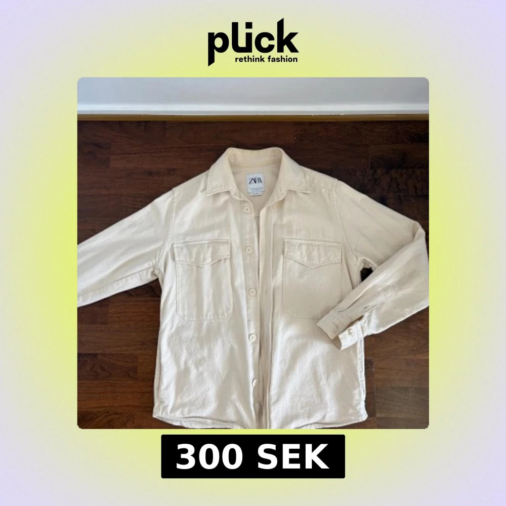 Snygg beige overshirt från Zara i bomull med relaxed fit. Två stora bröstfickor framtill och knäppning med knappar. På ryggen finns ett coolt print med palmer i brunt och svart. Perfekt för lager-på-lager och chill stil samt hösten och våren.