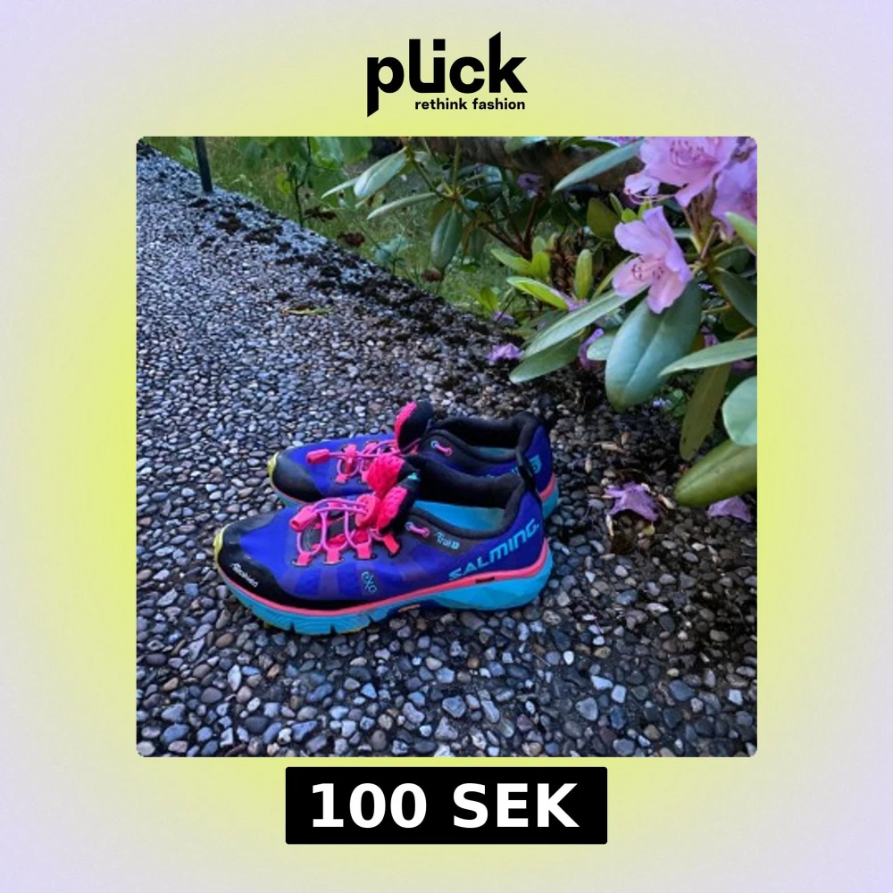 Färgstarka löparskor från Salming i blått med rosa detaljer och snörning. Skorna har svarta och turkosa inslag, samt robust sula för bra grepp.