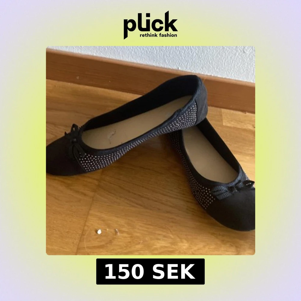 Snygga svarta ballerinaskor från Alley med små silvriga nitar längs sidorna och en söt rosett framtill. Skorna har rund tå och platt sula, samt en mjuk insida för extra komfort. Perfekta för dig som gillar en stilren men ändå glittrig look.