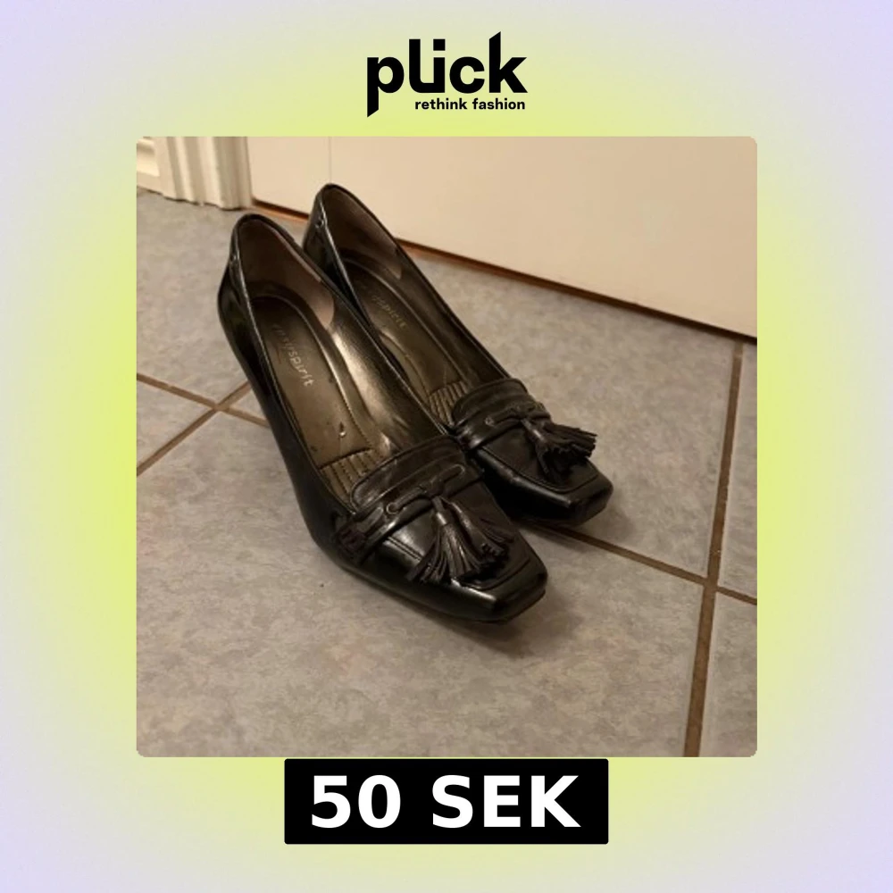 Säljer ett par svarta klackskor från Easyspirit med dekorativa tofsar framtill och fyrkantig tå. Skorna har en låg klack och är tillverkade i blankt skinn. Perfekta för dig som vill ha en klassisk men ändå unik look.