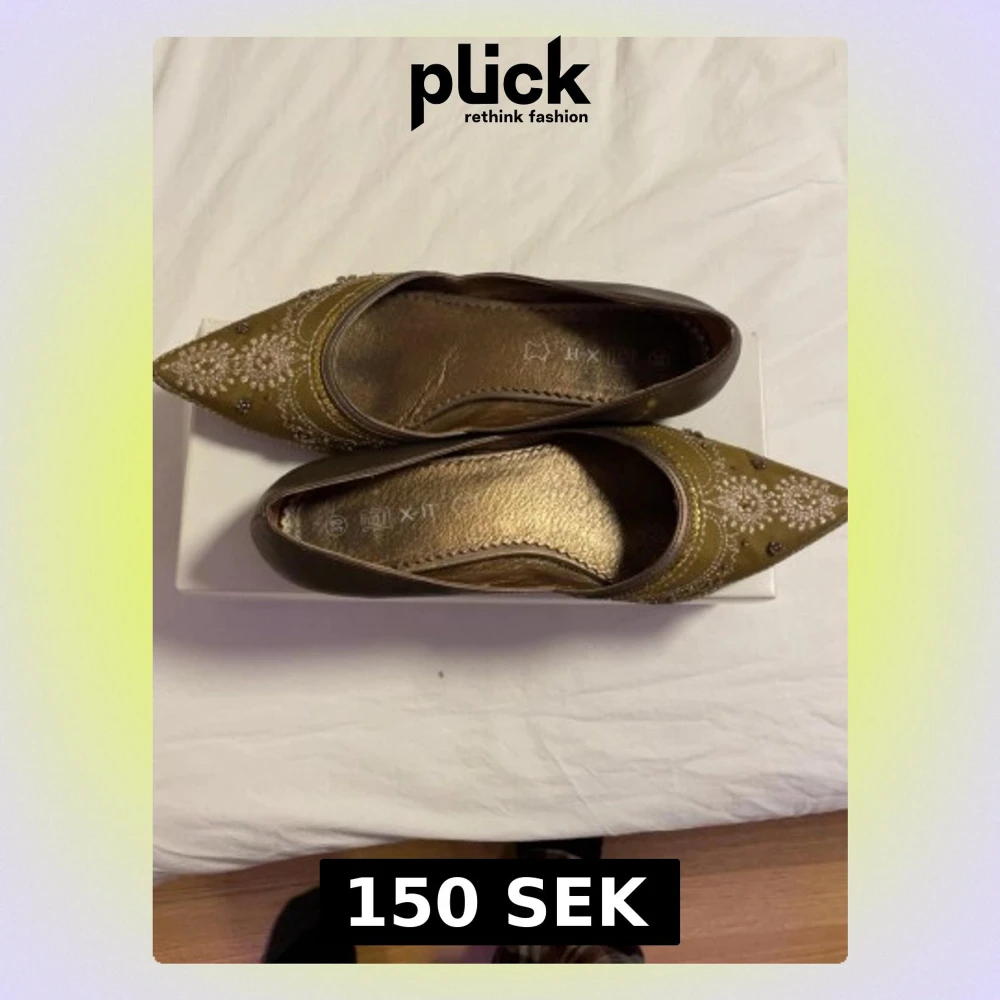 Snygga ballerinaskor i guld med spetsig tå och dekorativa broderier samt pärldetaljer. Skorna har en platt sula och är tillverkade i syntetmaterial med glittriga inslag. Perfekta för dig som vill sticka ut med en unik och elegant stil.