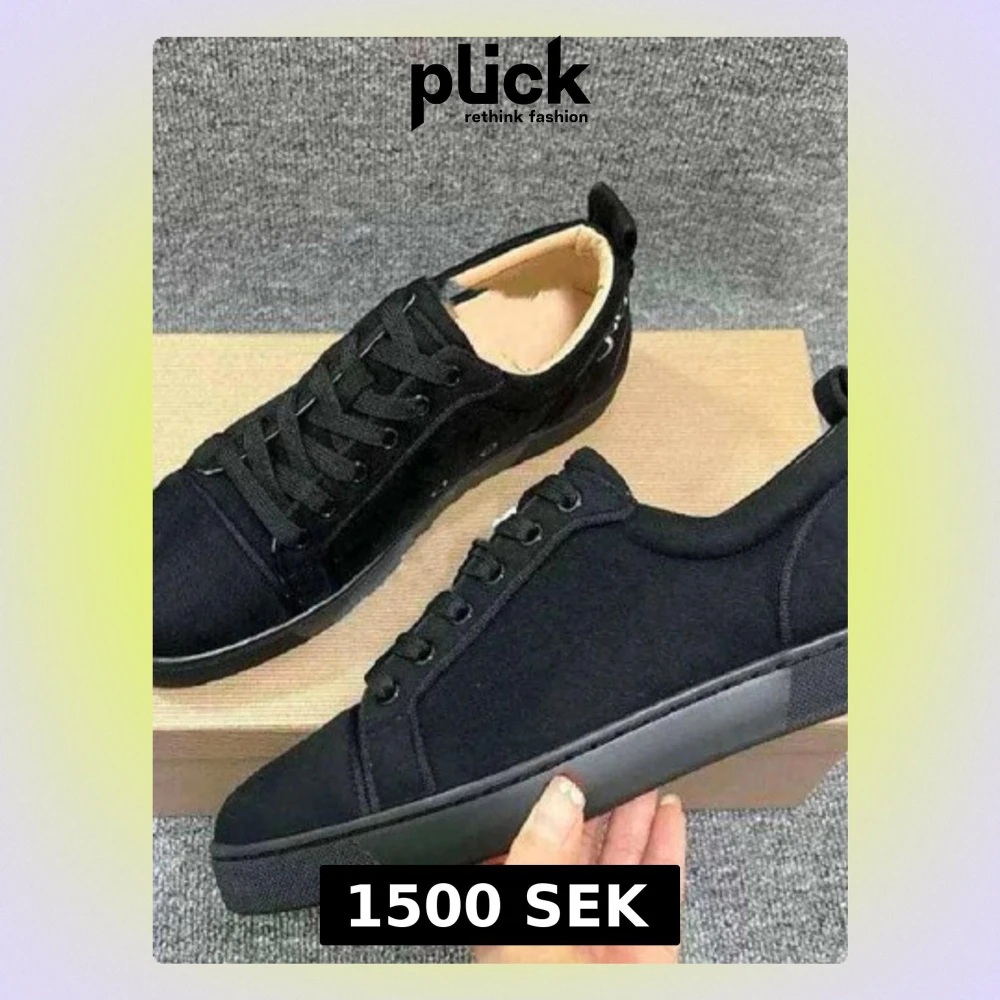 Svarta sneakers med mörk broderad logga på hälen. Skorna har snörning, rund tå och platt röd sula. Ovandelen är i mocka och insidan är ljusbeige. Snygg och stilren design som passar till många outfits. Fantastisk kvalite!!! Levereras med box,dustbag, kvitton, intyg och skohorn som ni ser på bilderna! Köpta här på plick. Storlek 40. Helt nya!