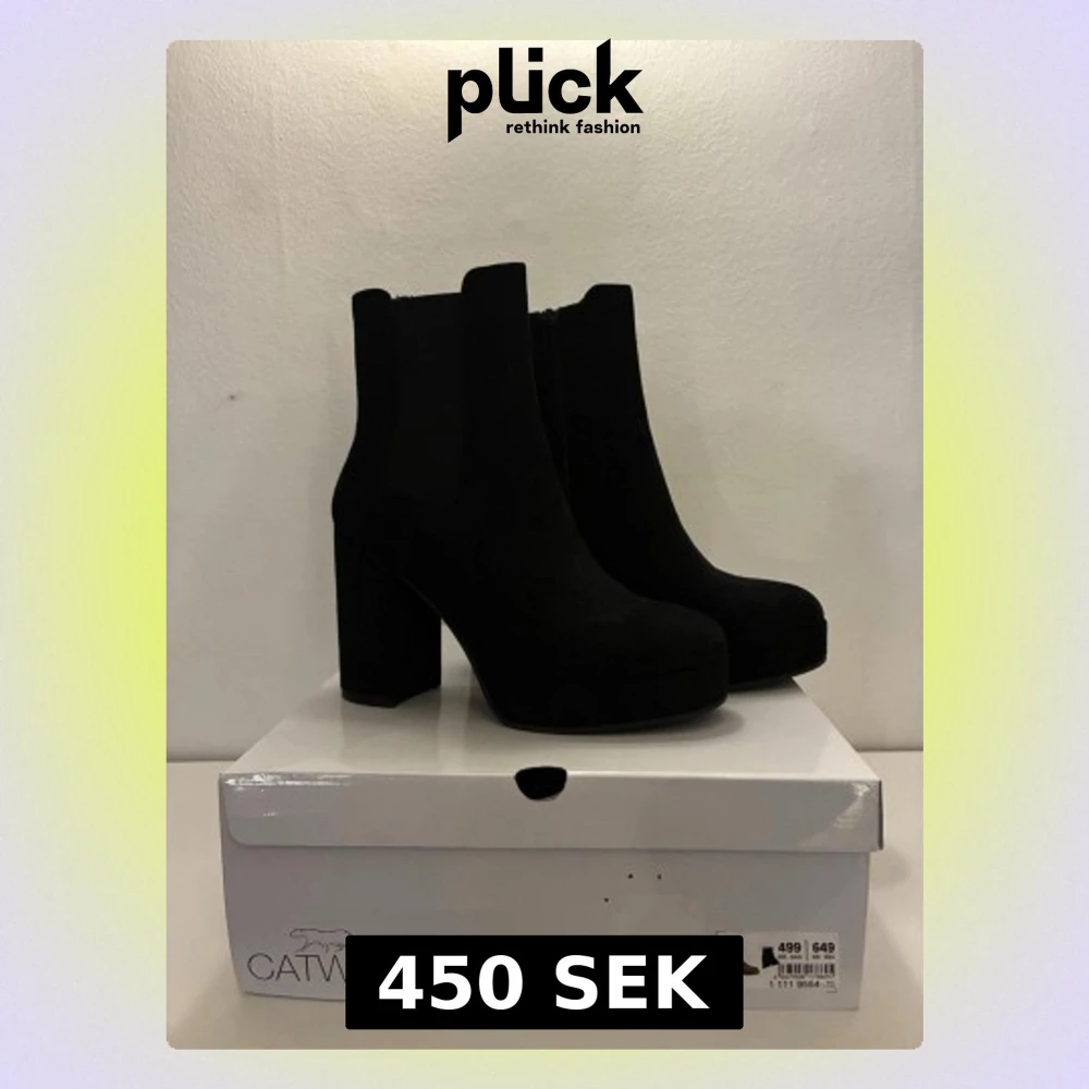 Stilrena svarta chelsea boots från Catwalk med hög klack och rund tå. Skorna är i mocka-look och har elastiska partier på sidorna för enkel påtagning. Perfekta för dig som vill ha en edgy och trendig stil. Klacken är cirka 11cm. Storlek 41 men liten i storlek så passar storlek 39/40.
