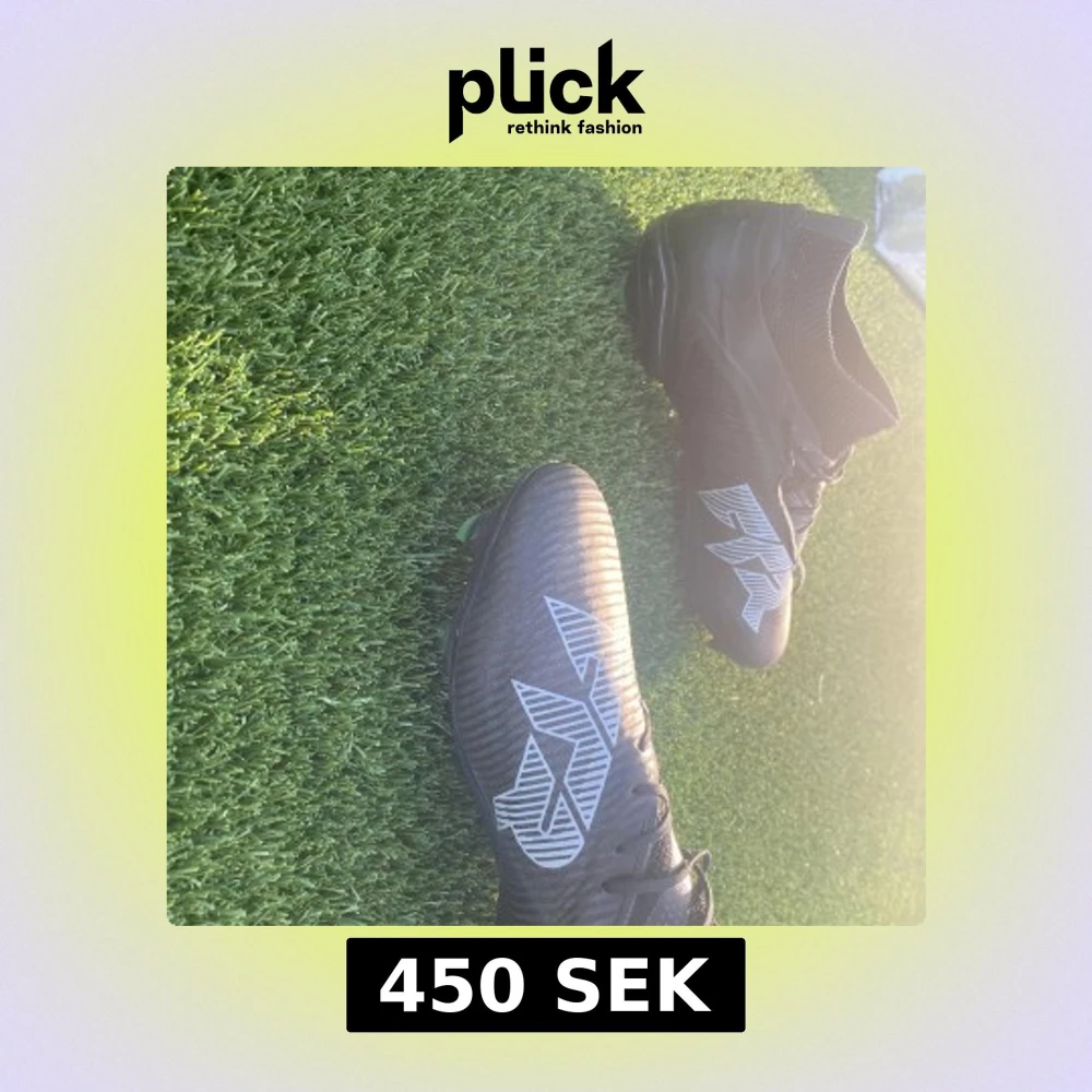 Snygga svarta fotbollsskor med vit grafisk logga på ovansidan. Skorna har snörning och en strumpliknande passform runt ankeln för extra stöd. Perfekta för spel på konstgräs och har en modern, sportig look.