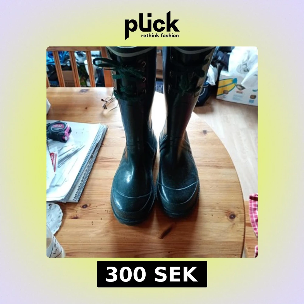 Snygga mörkgröna höga stövlar med grov sula och snörning framtill. Tillverkade i syntetmaterial med rund tå och platt sula. Perfekta för regniga dagar eller utomhusaktiviteter. Sparsamt använda i stl 41.