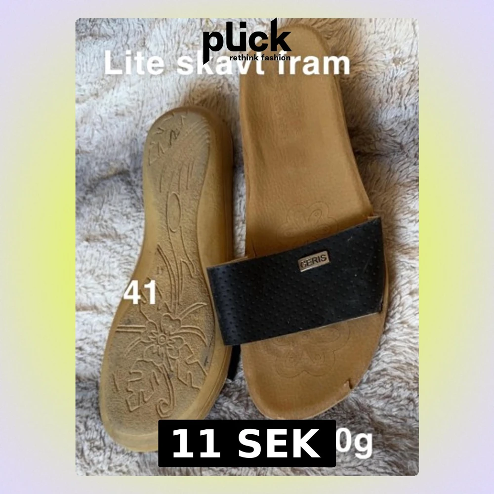 Säljer ett par stilrena sandaler i storlek 41. De har en svart, perforerad rem över foten och en ljusbrun sula med blommönster undertill. Perfekta för varma dagar och enkla att matcha med olika outfits.🌸 Lite skav fram. Storlek 41