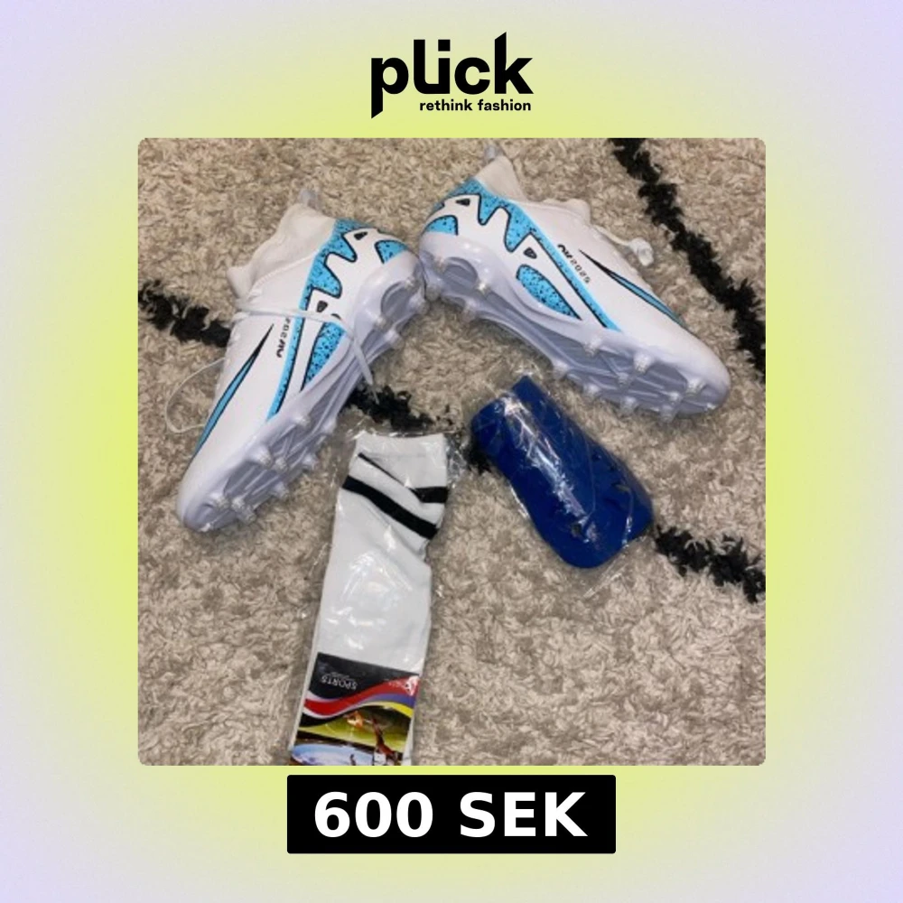 Säljer ett par vita fotbollsskor med blå och svarta detaljer. Skorna har snörning, platt sula med dobbar och en högre strumpliknande krage för extra stöd. Materialet är syntet och designen är sportig med coola grafiska mönster. Perfekt för dig som vill sticka ut på planen.