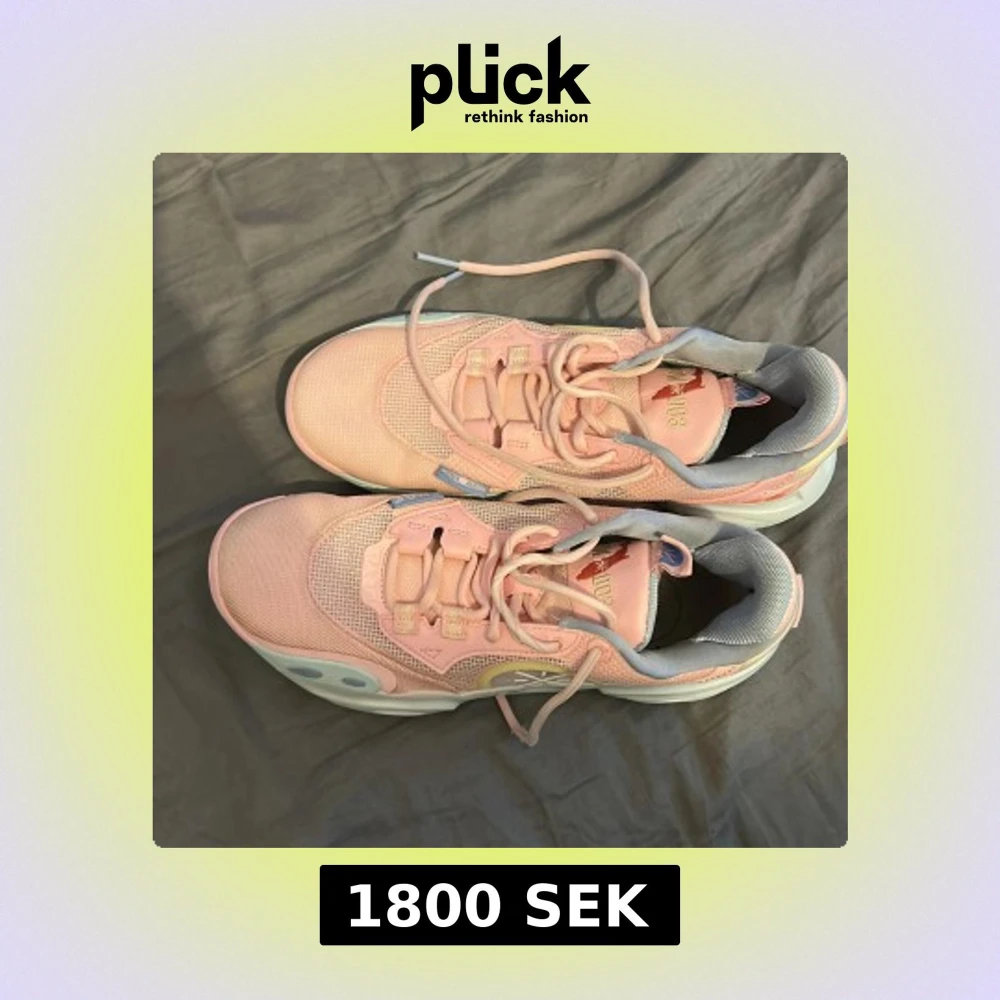 Säljer ett par rosa sneakers från Li-Ning med meshdetaljer och snörning. Skorna har vita och ljusblå inslag samt unikt mönstrad häl i rött och vitt. Sulan är mönstrad i grått och gult. Perfekta för dig som gillar färgglada och sportiga skor.