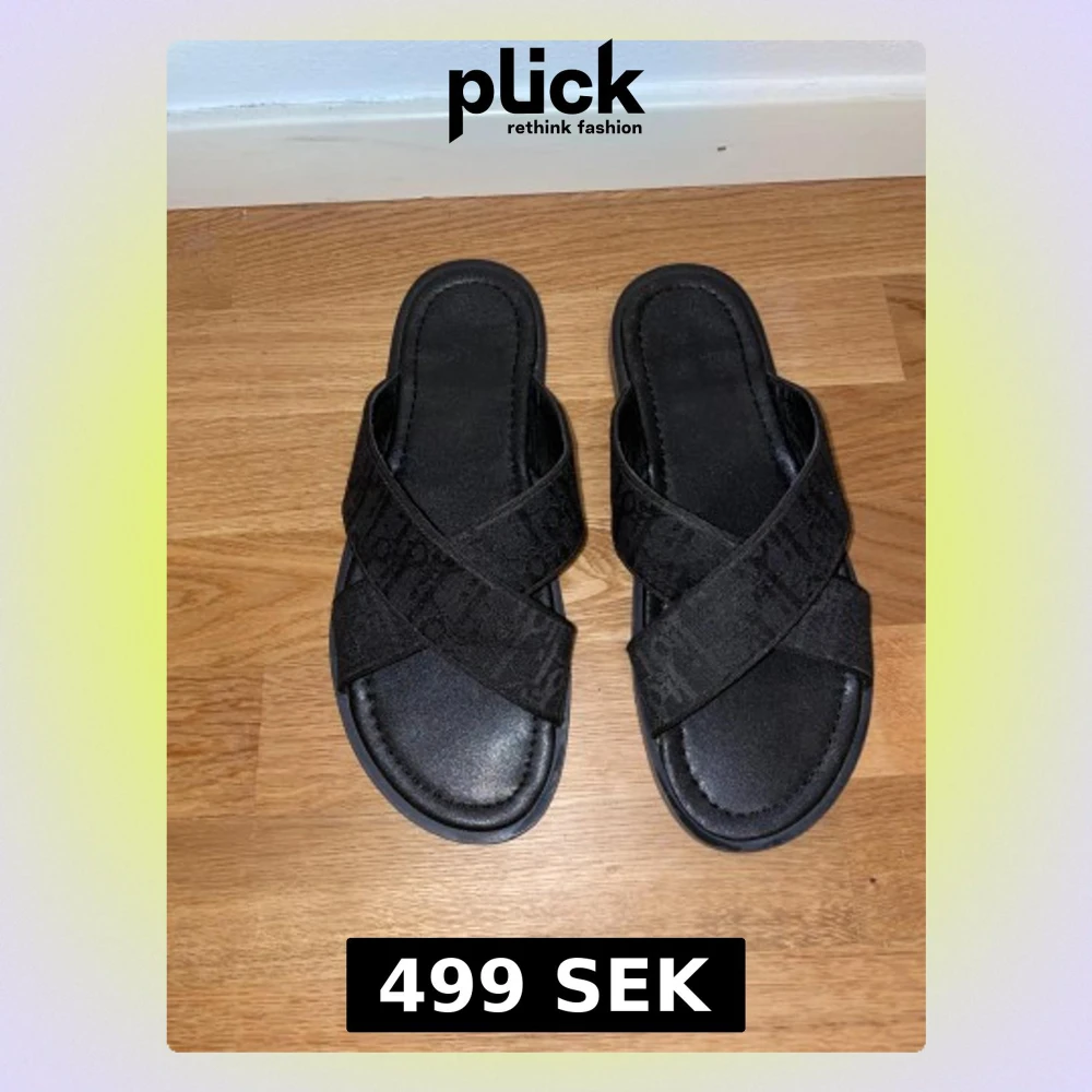 Säljer ett par svarta sandaler med breda korsade band över foten. Ovandelen är i textil med subtilt mönster och sulan är platt och bekväm. Perfekta för varma dagar och enkel att slänga på sig. Snygg och stilren design som funkar till många outfits.