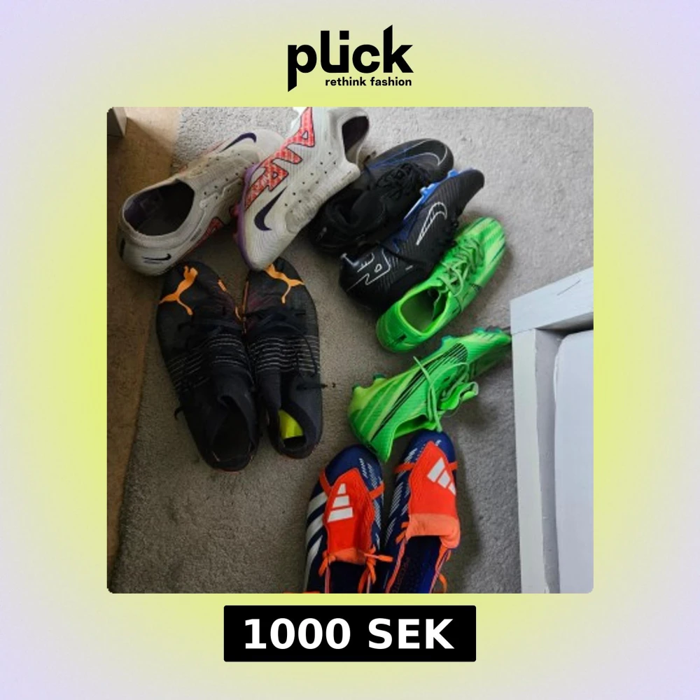 Säljer flera par fotbollsskor i olika färger och modeller. Här finns bland annat vita Nike med lila och röd detalj, svarta Nike, gröna Adidas och blå-röda Adidas Predator. Perfekta för dig som vill ha snygga och funktionella skor på planen.
