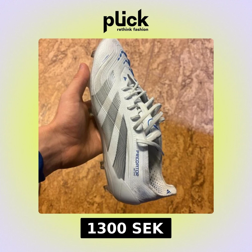 Säljer ett par Adidas Predator fotbollsskor i vitt med blå detaljer och gråa ränder. Skorna har snörning, platt sula med dobbar och är tillverkade i syntetmaterial. Perfekta för dig som vill sticka ut på planen med stilren design och grym känsla på bollen. Skorna är i nyskick