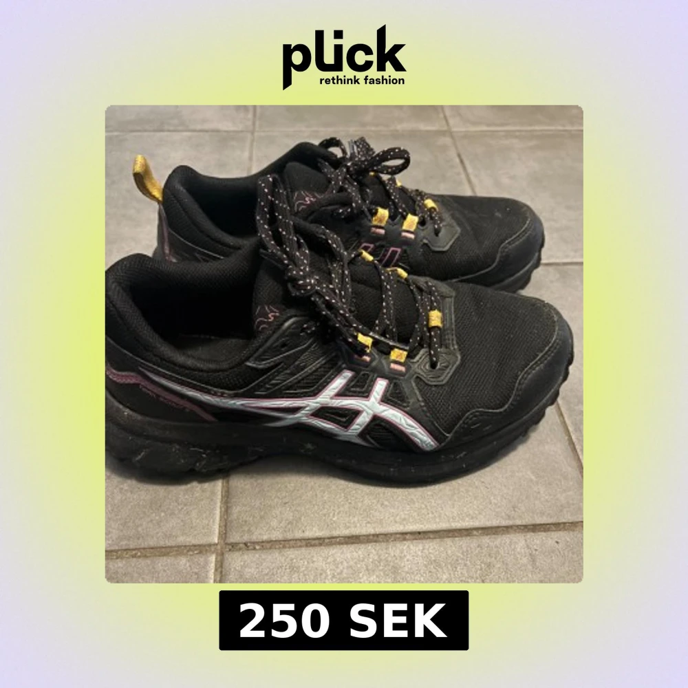 Svarta ASICS Trail Scout 3 löparskor med rosa och vita detaljer samt gula dragflikar. Grov sula för extra grepp. Strl 38, 24 cm