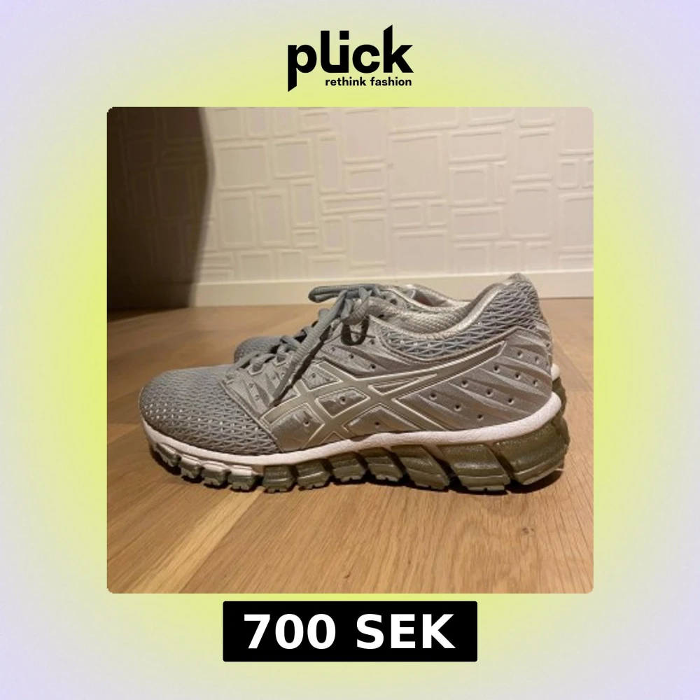 Säljer ett par grå Asics Gel-Quantum sneakers med cool mesh-överdel och tydlig Asics-logga på sidorna. Skorna har snörning, dämpad sula och sportig vibe. Perfekta för dig som gillar stilrena och bekväma träningsskor. Pris kan diskuteras!