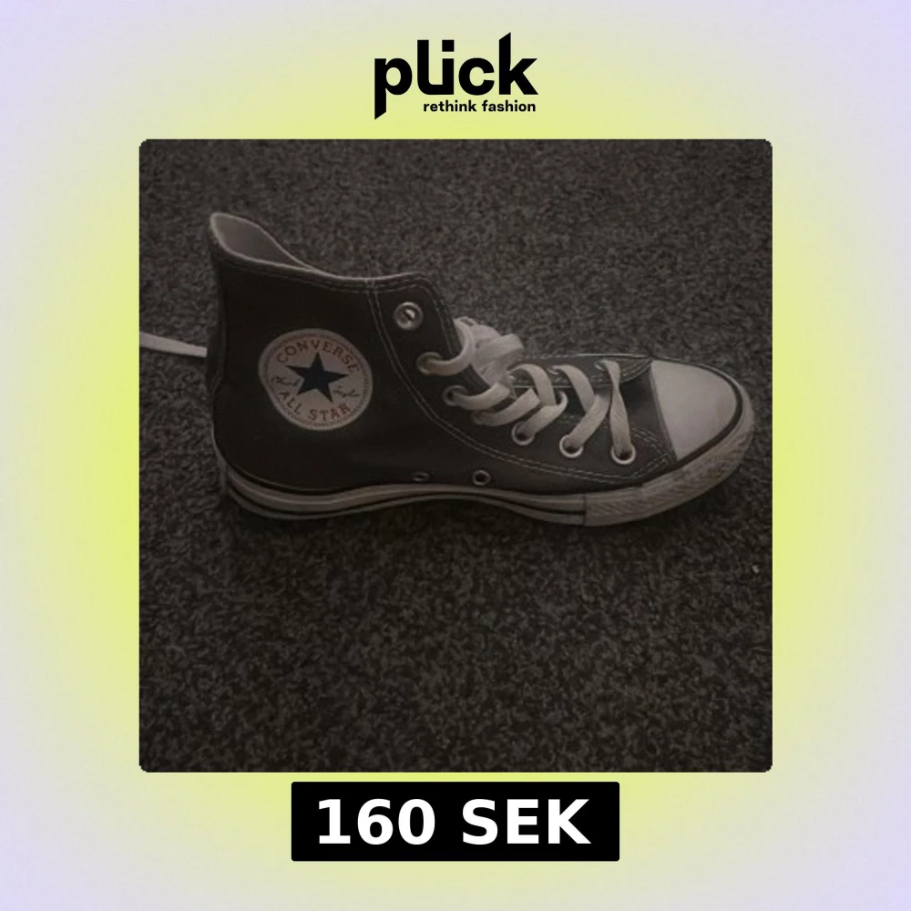Klassiska gråa Converse All Star high-tops med vit tå och vita snören. Skorna har rund tå, platt sula och tydliga vita sömmar. Ikonisk logga på sidan och slitstark canvas. Perfekta för en cool och avslappnad stil. Nästan helt nya bara använda några gånger