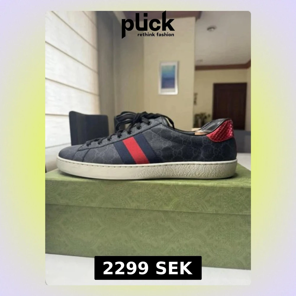 Säljer ett par svarta Gucci Ace sneakers i storlek 42. Skorna är i extremt bra skick inga defekter osv. Allt og ingår box, dustbag och Gucci påsen. För fler bilder eller frågor skriv privat. Kan gå ner i pris vid snabb och smidig affär.