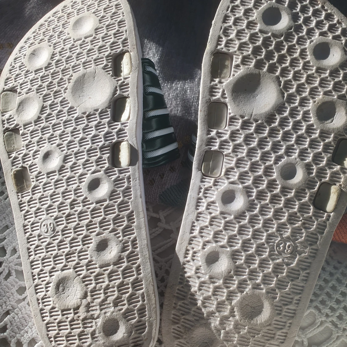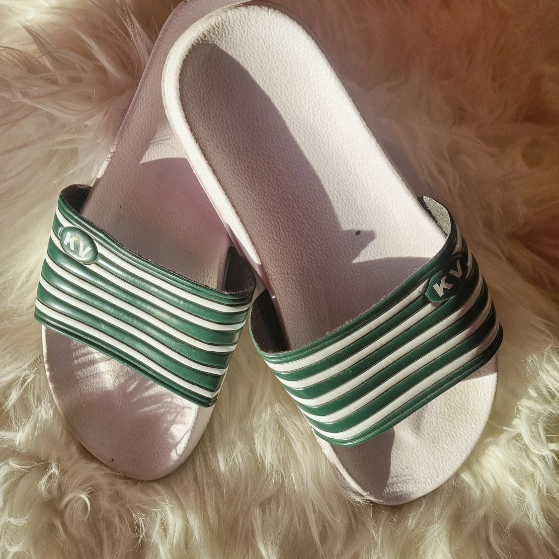 Snygga slides från KV med gröna och vita ränder över foten. Skorna har en platt sula och är tillverkade i syntetmaterial. Perfekta för sommardagar eller att chilla hemma. Klassisk design med öppen tå och bekväm passform. Kommer från anstalten Hinseberg